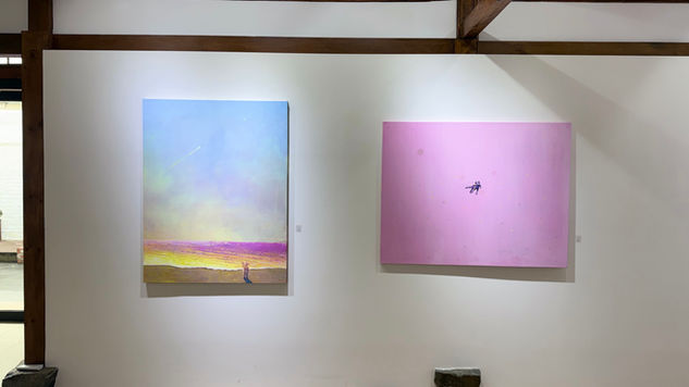 유가은 작가 역시 현실과 환상 사이의 공간에 주목한다. 작가는 이상과 현실 사이에 존재하는 환상적 자아 공간을 구성하지만, 이번 전시에서는 그 공간에 머무르기보다 현실로 자신을 다시 끌어당기는 힘에 집중한다. 직접 경험한 사진과 수집된 이미지를 재조합한 화면은 현실과 환상의 경계를 흐리며, 동시에 그 경계가 다시 현실로 돌아오게 만드는 긴장을 형성한다. 유가은작가에게 메기는 외부의 압박이 아니라, 환상에 안주하지 않도록 스스로를 현실로 소환하는 내적 질문이다.